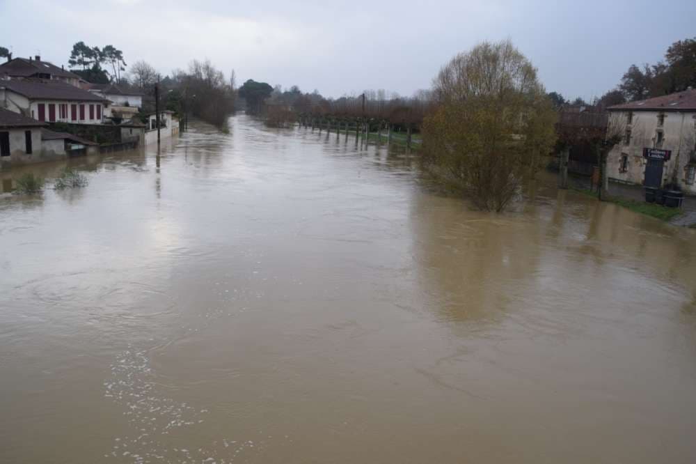 En raison des sols gorgés d’eau et des précipitations successives, les niveaux sont particulièrement élevés à l’aval de la confluence entre la Midouze et l’Audour. Les premiers débordements sont observés entre Pontonx et Dax depuis ce jeudi.