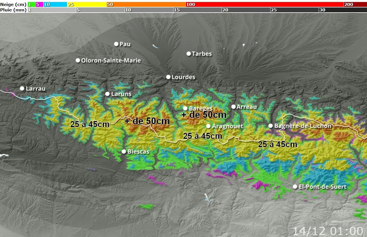 Cumuls neigeux envisagés entre ce vendredi 11 et lundi 14 décembre sur l'Ouest des Pyrénées - Via skipass