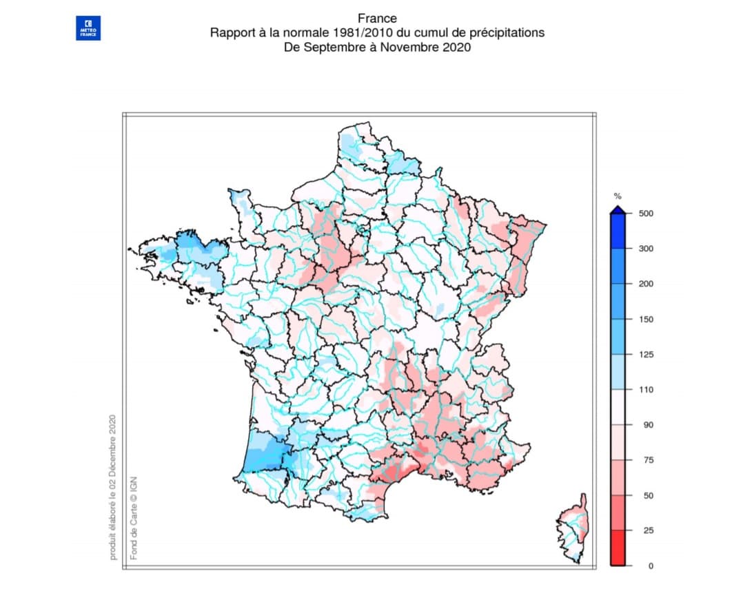 Cet automne s'est également montré très pluvieux sur cette partie du pays, même si le mois de Novembre fut généralement sec. Entre Septembre et Novembre les cumuls de précipitations se sont déjà montrés excédentaires sur de larges secteurs du Sud-Ouest, notamment l'Aquitaine :