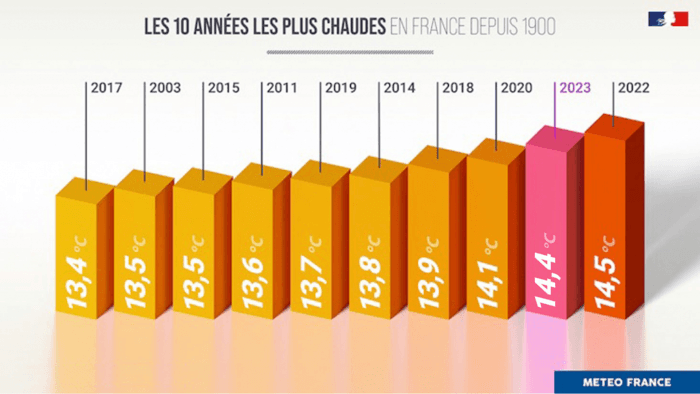 Top 10 des années les plus chaudes en France - graphique Météo France