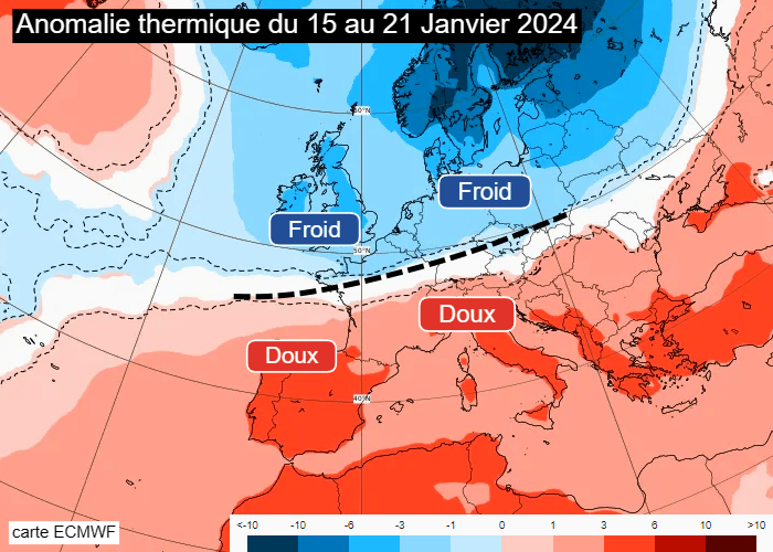 L'anticyclone britannique s'effacera la semaine prochaine avec le retour des basses pressions en Mer du Nord. Celles-ci devraient interagir avec des anomalies dépressionnaires transitant vers les Açores, amenant le retour d'un courant océanique plus perturbé sur notre pays, surtout à compter du mercredi 17 janvier 2024. Cependant, il se pourrait que certaines de ces anomalies dépressionnaires transitent sur le nord de la France. Dans ce cas, elles maintiendraient de l'air froid sur les régions septentrionales tandis qu'une grande douceur envahirait une large moitié sud. Ainsi, nous pourrions assister à des journées très contrastées entre nord et sud...