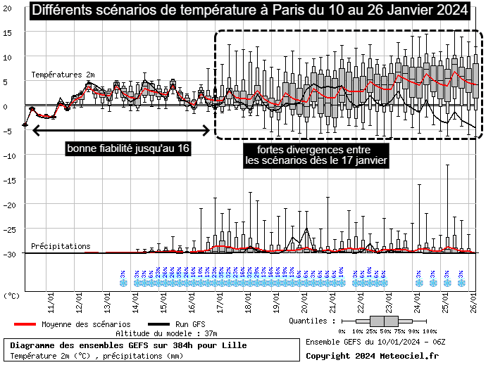 Scénarios de température à Paris du 10 au 26 janvier 2024 - via meteociel.fr