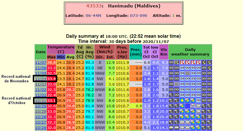 Températures maximales sur la commune de Haanimadhoo du 26/10 au 07/11 - via twitter @EKmeteo