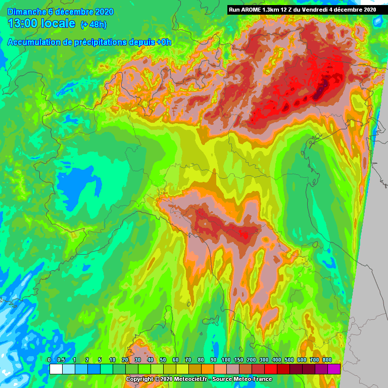 Cumuls envisagés durant le week-end sur le Nord de l'Italie - Modèle arome via météociel.fr