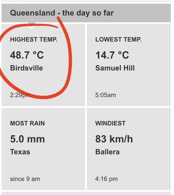 L’été s’installe de plus en plus franchement en Australie avec une vague de chaleur particulièrement forte et persistante sur le Centre et l’Est du pays. Les températures ont atteint des niveaux records pour la période dans l’Ouest du Queensland avec 48.7°C relevés à Birdsville ce samedi 5 décembre.