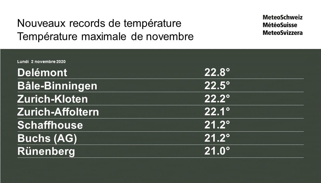 Records de chaleur pour un mois de Novembre en Suisse le 2 Novembre - Météo-Suisse