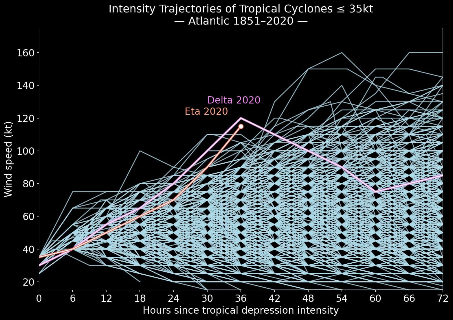 Renforcement des vents en fonction de la durée depuis le classement en tempête tropicale en Atlantique Nord - via twitter @splillo
