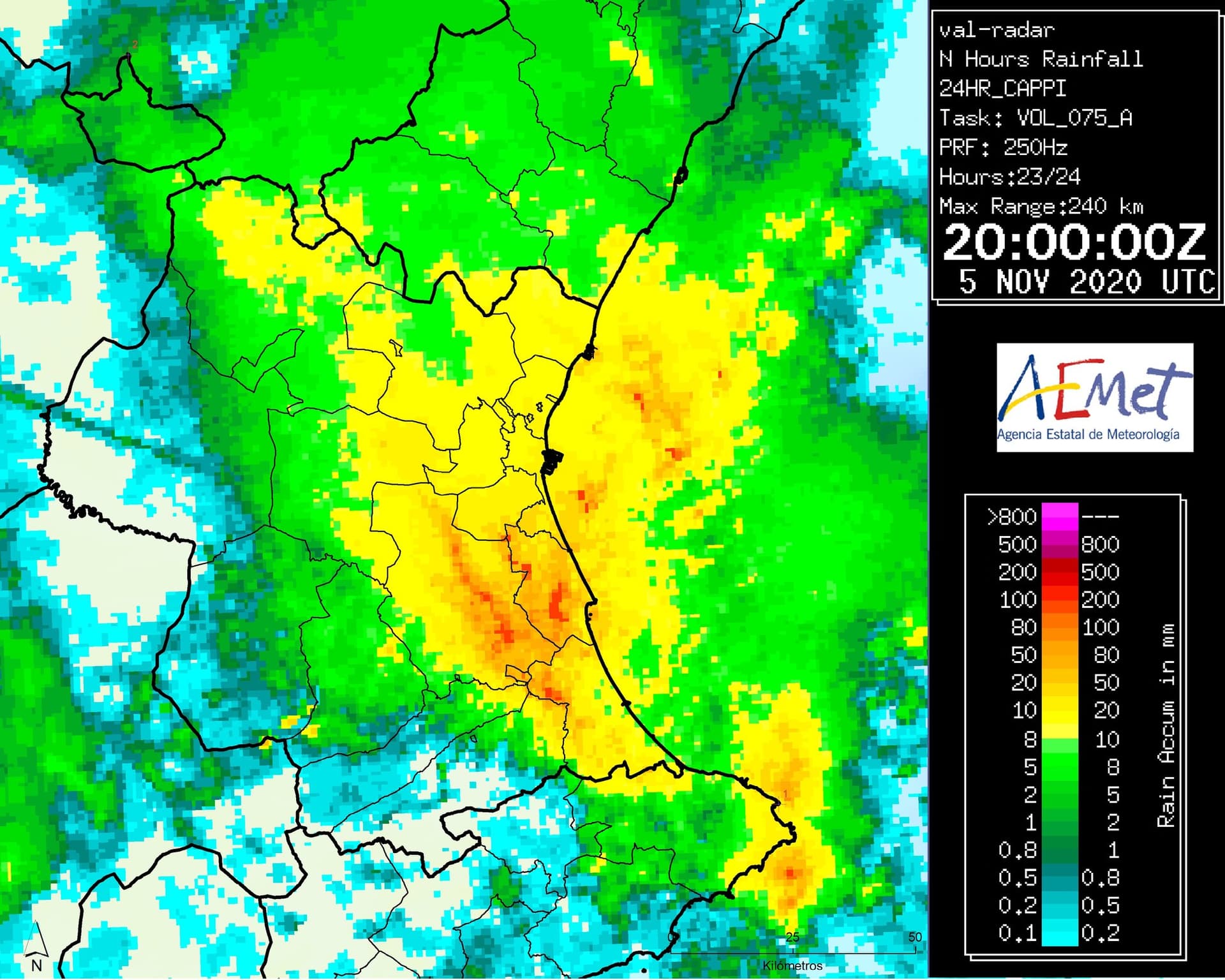 C’est pendant la journée du 5 Novembre que ces précipitations ce sont montrées les plus intenses avec plus de 300mm en 24h au Sud de Valence près d'Alzira.