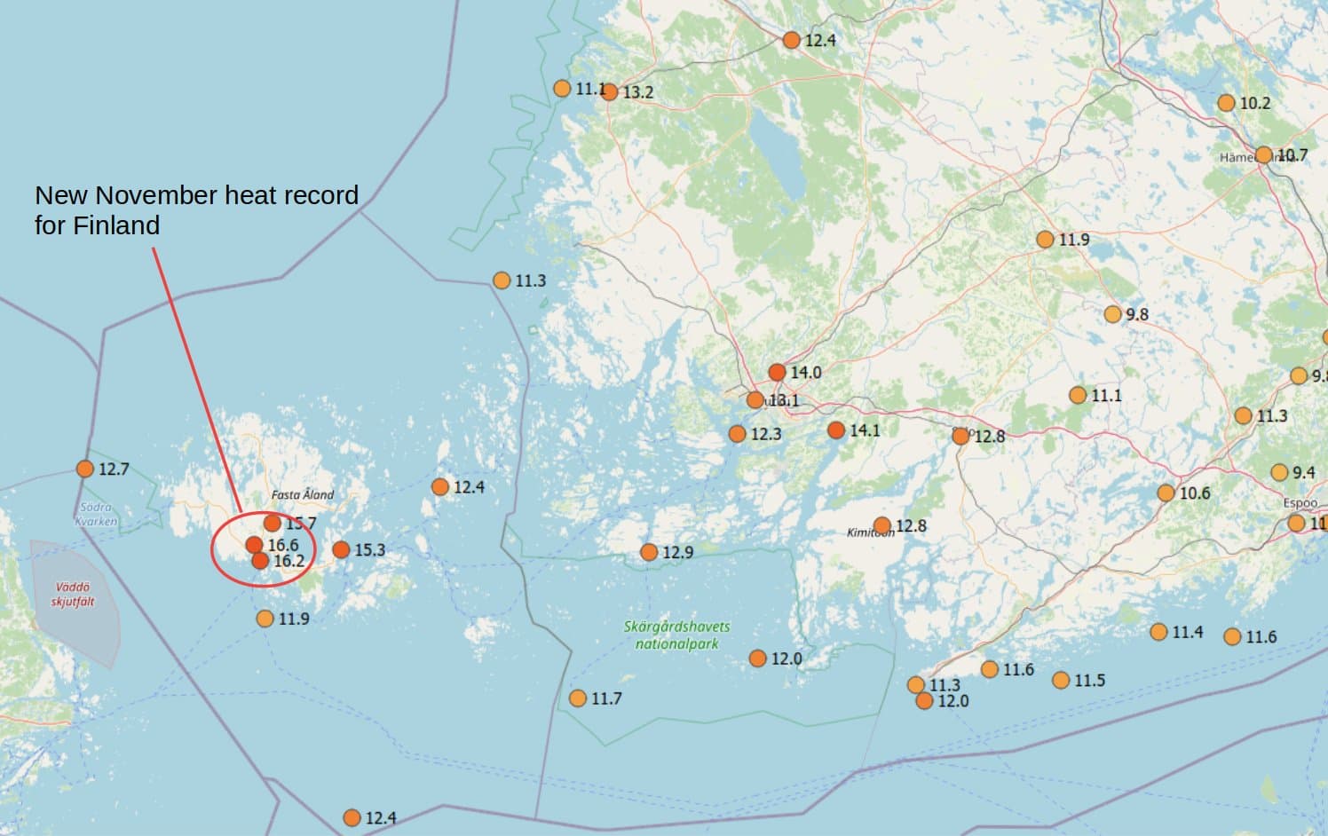 Ce 6 Novembre, c’est la localité de Marihamm qui battait ce record de 1.9°C avec jusqu’à 16.6°C au meilleur de la journée.