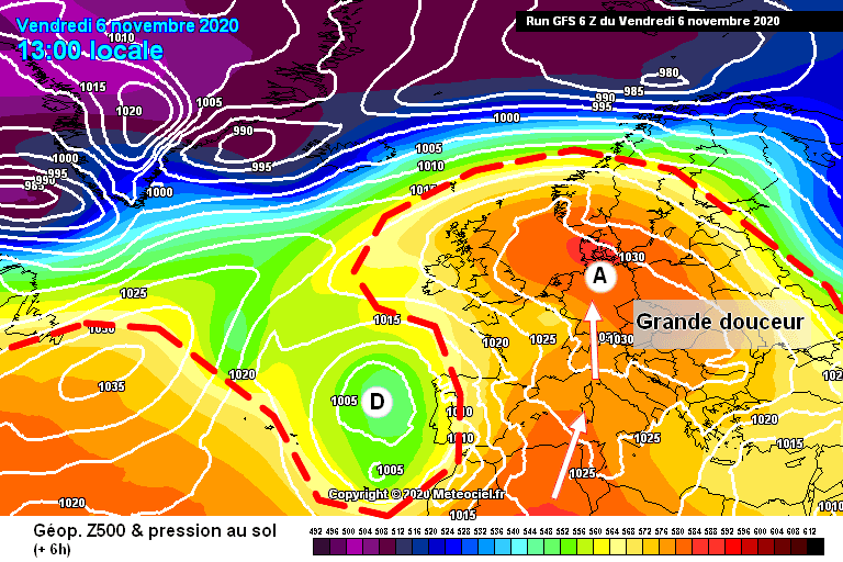 Schéma de la situation atmosphérique sur l'Ouest de l'Europe ce Vendredi 6 Novembre - Modèle GFS via météociel.fr