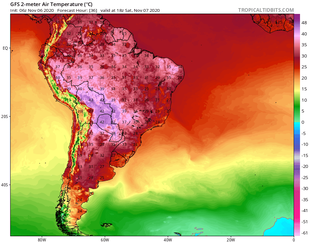 Températures maximales prévues en journée du Samedi 7 Novembre sur le Sud du continent américain - Via tropicaltidbits.com