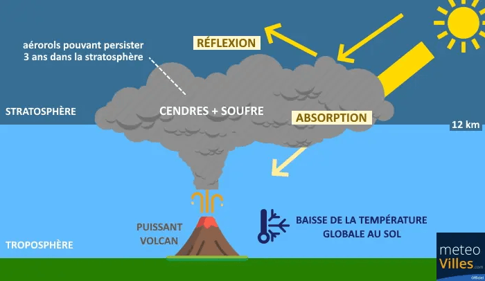 Schéma du refroidissement climatique engendré par une violente éruption volcanique - Météo Villes