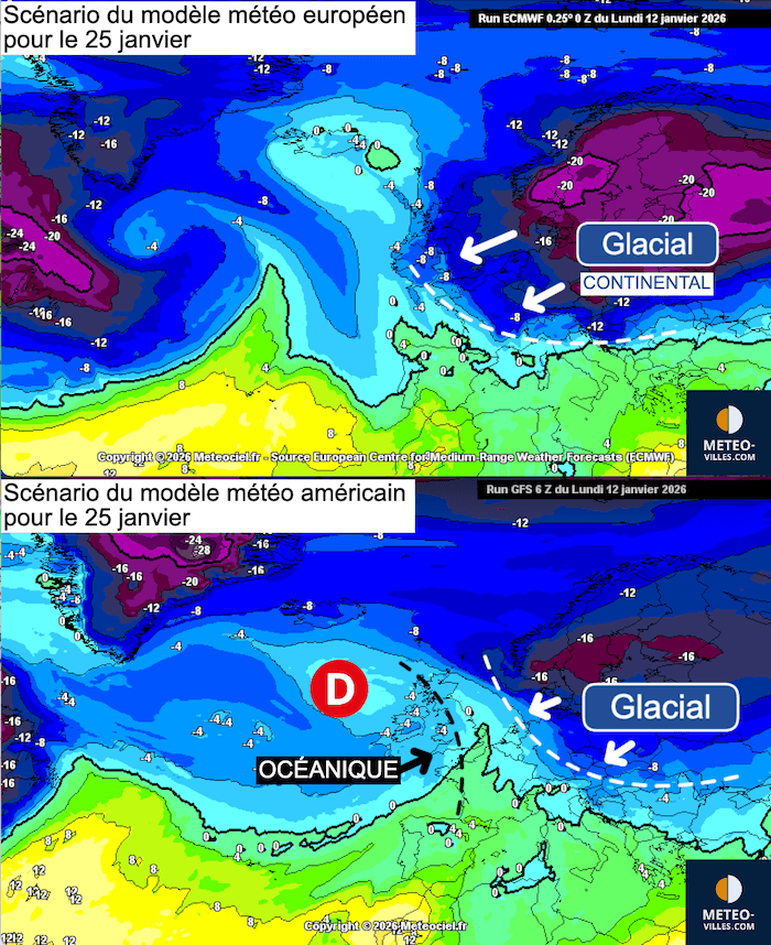 Selon l'un des scénarios du modèle météo européen (carte du haut) l'air glacial venu de Scandinavie et de Russie pourrait déferler sur la France à partir du 25 janvier. Selon le scénario du modèle météo américain (carte du bas), la situation serait beaucoup plus nuancée… Tout reste donc possible !