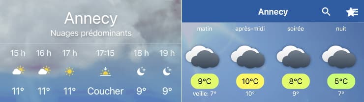 Comparaison entre la météo de iPhone (application par défaut avec prévisions automatiques via le modèle américain) et celle de l'application expertisée Météo Annecy (météo-villes)