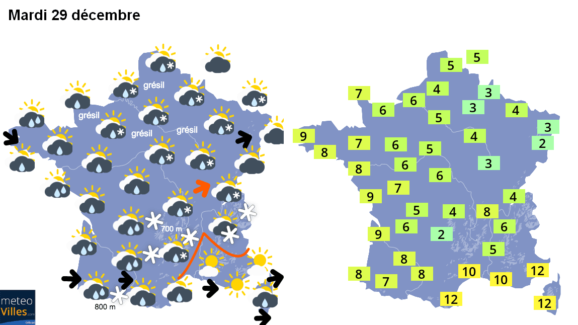 Temps attendu pour le mardi 29 décembre sur le pays avec régime de giboulées bien étendu et air froid – Météo-Villes