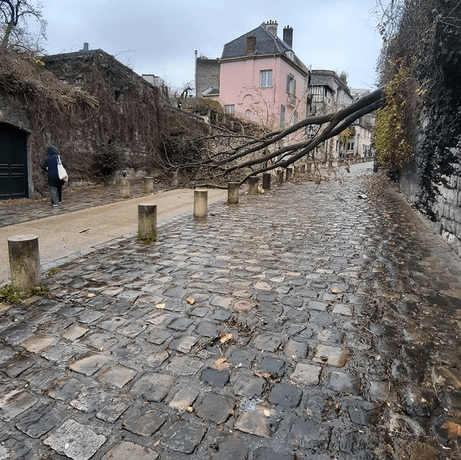 Arbre couché rue de l’abrevoir à Montmartre ce dimanche 27 décembre suite aux fortes rafales – Via Instagram : @anne_m_fourtines75