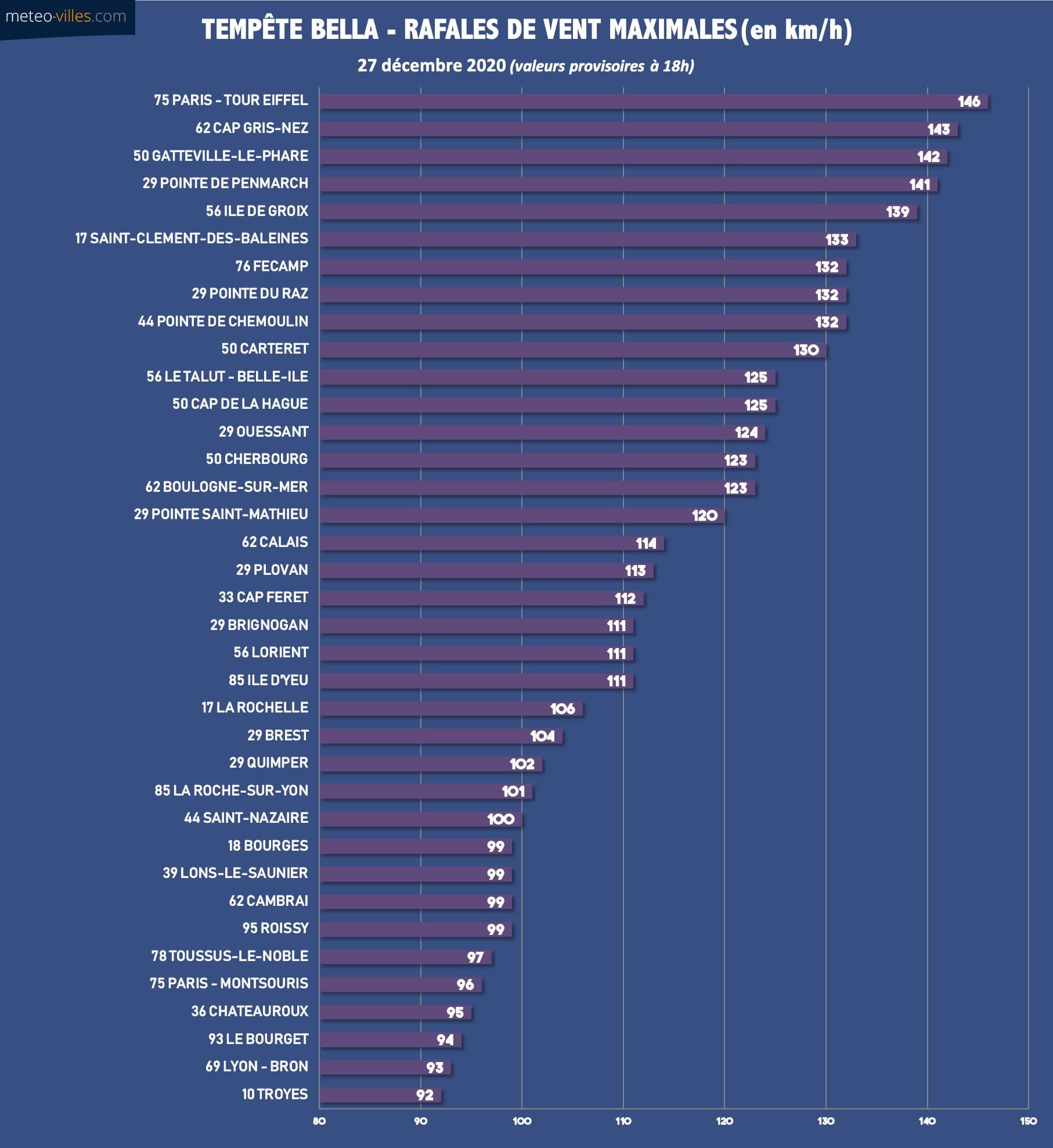 Rafales de vent maximales relevées en journée du dimanche 27 décembre 2020 – Météo-Villes