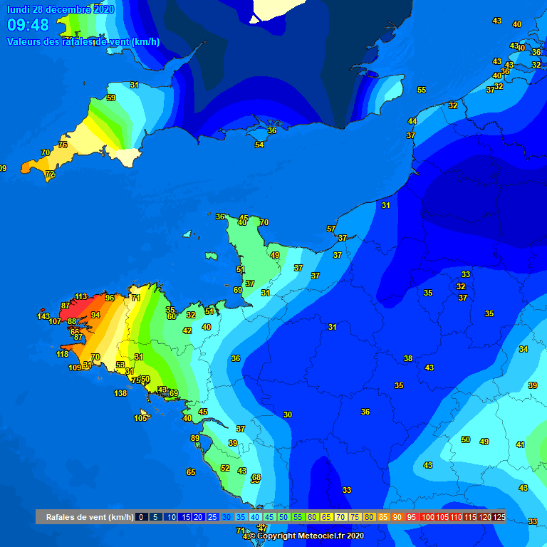 Valeurs de vent maximales relevées en milieu de matinée du lundi 28 décembre sur la Bretagne – Via météociel.fr