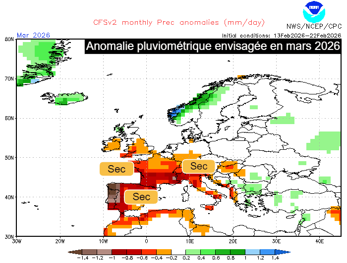 Anomalie pluviométrique envisagée en Europe en mars 2026 - NOAA