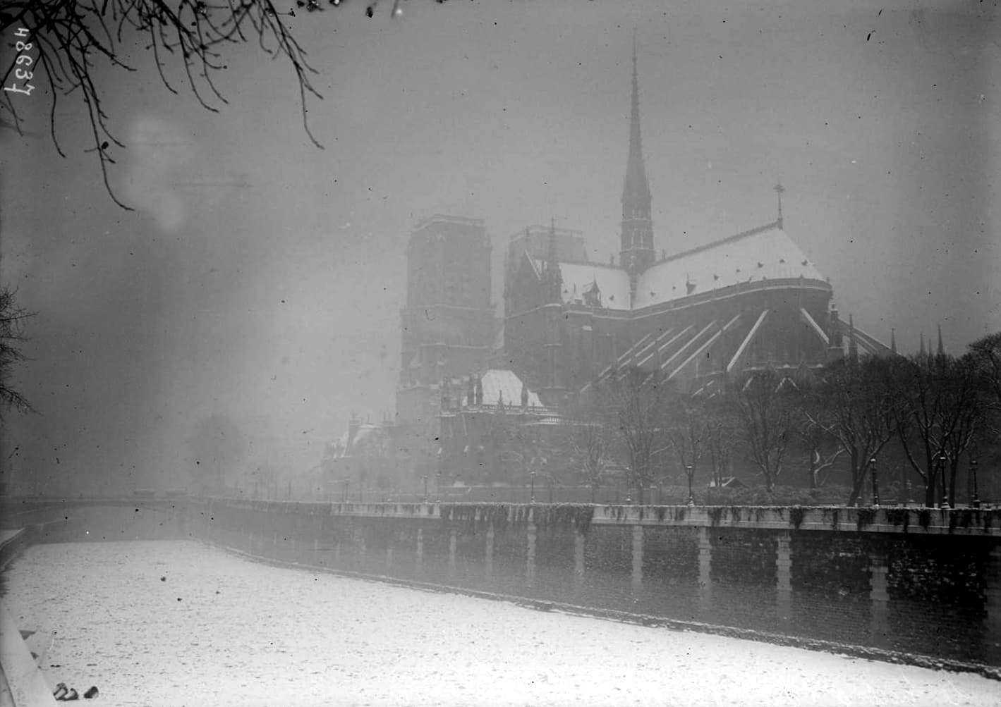 En janvier 1917, en pleine Première Guerre mondiale, plusieurs photos montrent la Seine gelée aux abords de Paris et jusque dans le centre, près du pont Saint-Michel. On y voit des plaques épaisses s’entrechoquer, des péniches bloquées et une brume glacée sur la ville.
