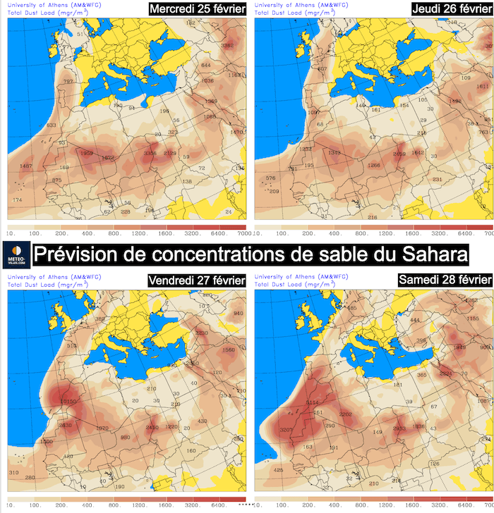 Prévisions des remontées de sable du Sahara d'ici samedi 28 février - météo grecque (université d'Athènes)