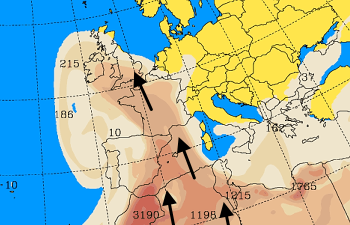 La configuration actuelle est un cas d'école de remontées de sable vers la France. En effet, une dépression est centrée entre l'Irlande et l'Islande et propulse un vaste talweg en direction du Portugal. À l'avant de ce dernier, un flux de sud venu d'Afrique remonte vers la France et s'accompagne de poussières sableuses mais également de températures particulièrement élevées (jusqu'à 35-37°C au sud-ouest ce jeudi après-midi).