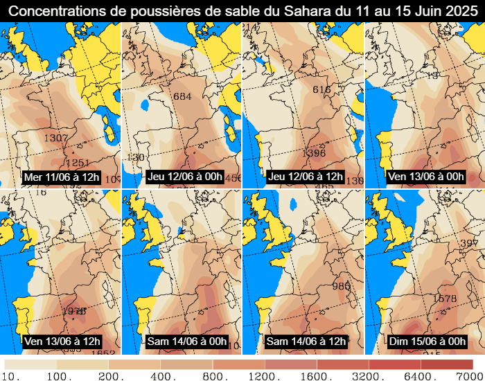 Ainsi, le sable du Sahara remonte sur une grande partie de la France ce mercredi 11 juin 2025. Les concentrations restent faibles à modérées et peuvent simplement blanchir le ciel. Ces quantités faibles à modérées de poussières sableuses vont continuer de survoler notre pays jusqu'au terme de la semaine. Si elles seront assez discrètes à l'œil nu, elles pourront occasionner des dépôts en cas d'averses et d'orages, qui seront amenés à se multiplier ces prochains jours.