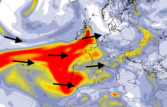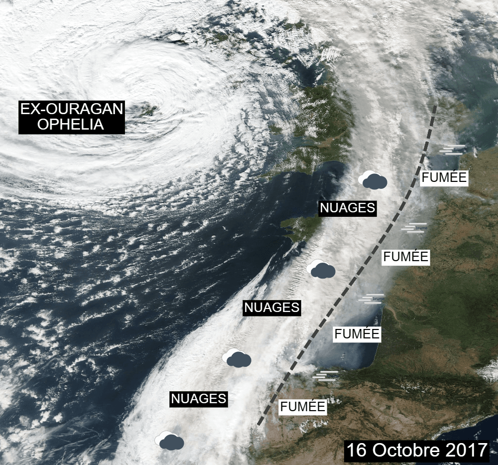 Les habitants de l'ouest de la France se souviendront sûrement du 16 octobre 2017. Ce jour, l'ex-ouragan Ophelia touchait l'Irlande et entraînait un puissant flux de sud sur l'hexagone. Problème : de violents incendies ravageaient le Portugal lors de cet automne 2017. La perturbation qui avait balayé la France fut précédée par une remontée spectaculaire de fumées des incendies portugais, comme l'illustre cette impressionnante image satellite. Ces fumées étaient remontées jusqu'en Angleterre, touchant notamment Londres.