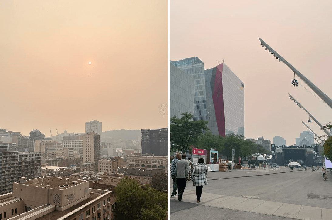 Depuis de longues semaines, des incendies d'ampleur inédite ravage le nord du continent américain. Le Canada est particulièrement touché avec des dizaines de brasiers toujours en cours de l'ouest jusqu'à l'est du pays. Le Québec n'est pas épargné et Montréal subi notamment de plein fouet les fumées venues de ces incendies. Ces dimanche 25 et lundi 26 juin 2023, la ville est fortement enfumée avec un ciel de couleur ocre et un soleil bien pâle, créant une ambiance presque apocalyptique. Dimanche, Montréal était même la ville avec la plus mauvaise qualité de l'air au monde !