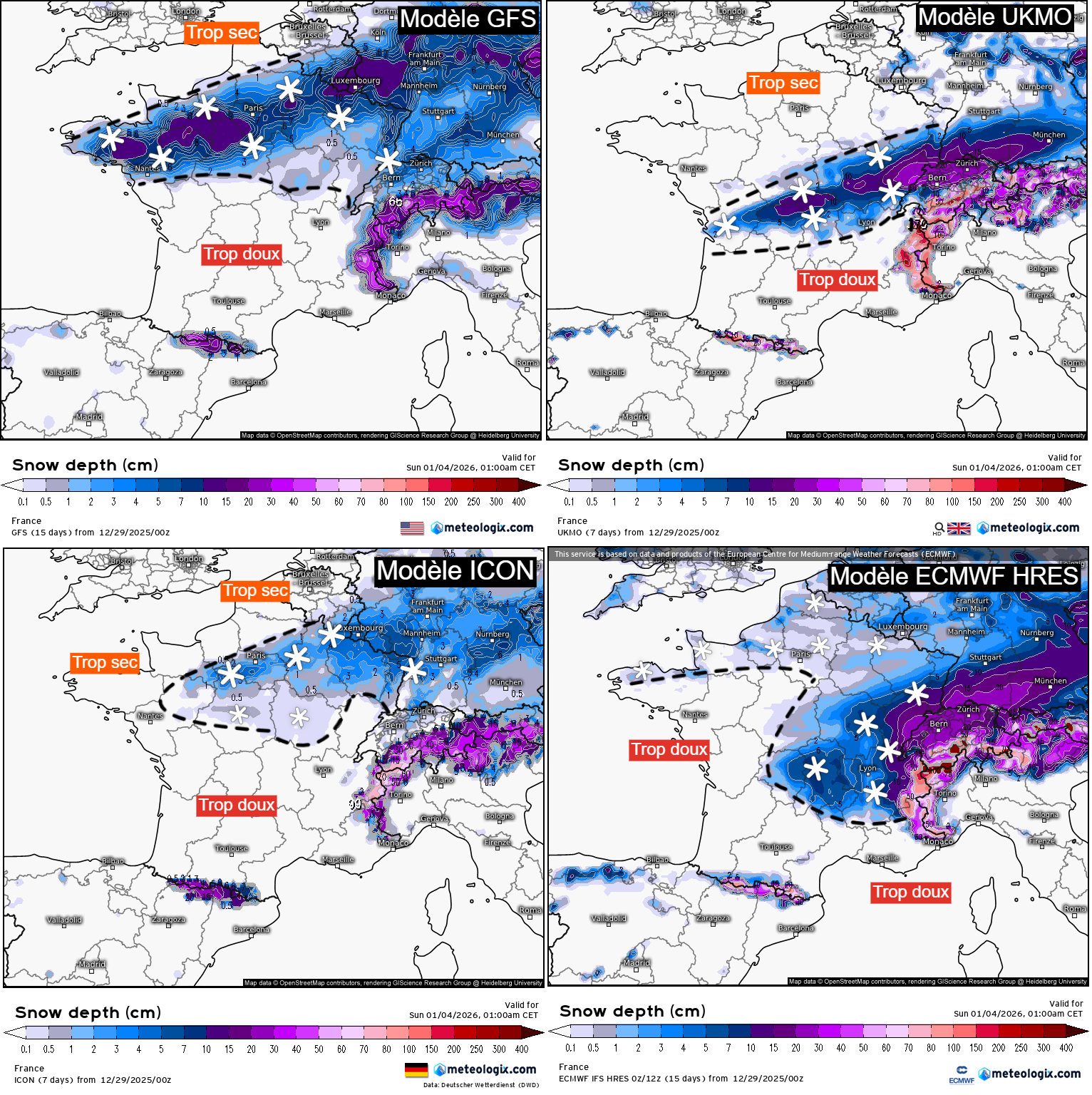 Différents scénarios de couche de neige au sol sur la France pour le week-end des 3 et 4 janvier 2026 – via Meteologix