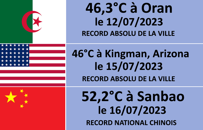 Ce dôme de chaleur méditerranéen affecte aussi le Maghreb où une canicule remarquable se produit. Le 12 juillet dernier, le thermomètre a atteint 46,3°C sur la ville côtière d'Oran en Algérie, battant un record absolu ! Mais cette canicule n'est pas la seule en cours. Un autre dôme de chaleur impacte le sud-ouest des USA où les températures battent également des records, comme à Kingman en Arizona avec 46°C le 15 juillet ! Enfin, la Chine subit elle aussi une canicule d'intensité historique. Avec 52,2°C à Sanbao le 16 juillet 2023, le pays tout entier a battu son record absolu de chaleur !