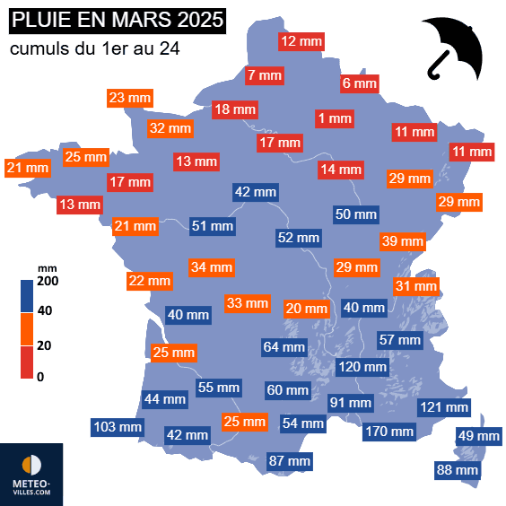 Cumuls de pluie en France du 1er au 24 mars 2025 - Météo Villes
