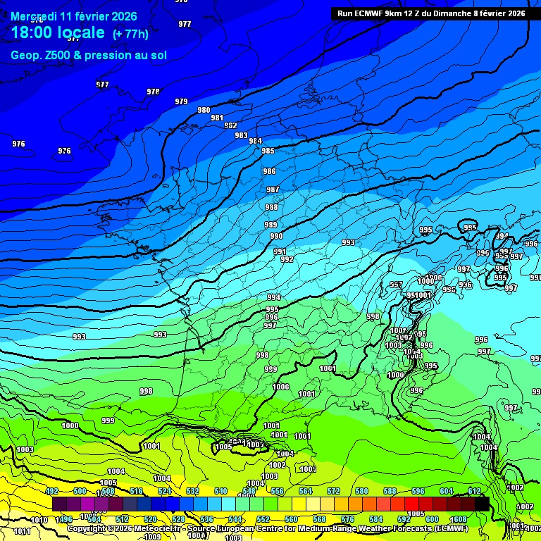 Évolution de la dépression entre mercredi soir et vendredi matin selon le modèle METEO européen - source fond de carte : Meteociel