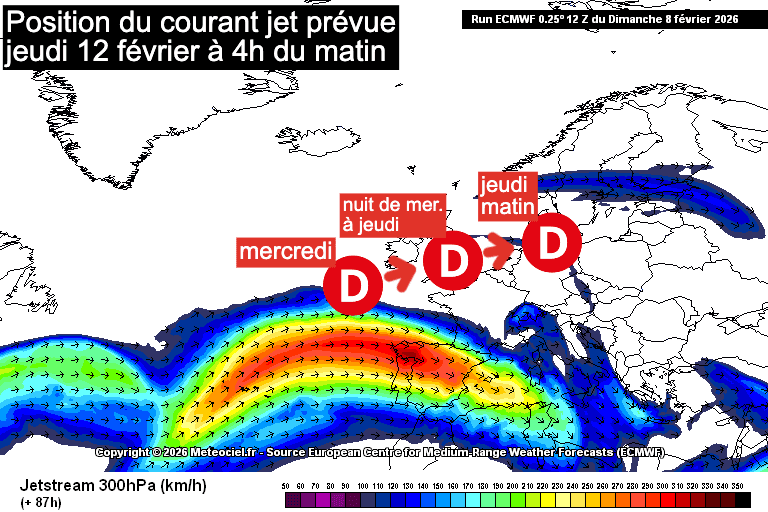 Position du courant jet prévue jeudi 12 février à 4h du matin - source fond de carte : Meteociel, retravaillée par Meteo-villes