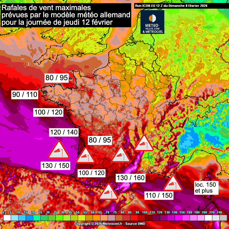 Le littoral aquitain et une grande partie de l’Occitanie, notamment les plaines du Roussillon et le relief du sud du Massif central, seraient particulièrement exposés à de violentes rafales, pouvant localement dépasser les 150 km/h. Le sud des Alpes et la Corse seront également très concernés.