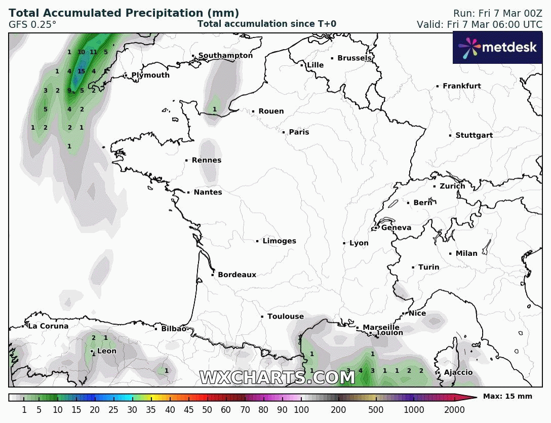 Animation des cumuls de précipitations du 7 au 14 mars 2025 – Modèle GFS via WX CHARTS