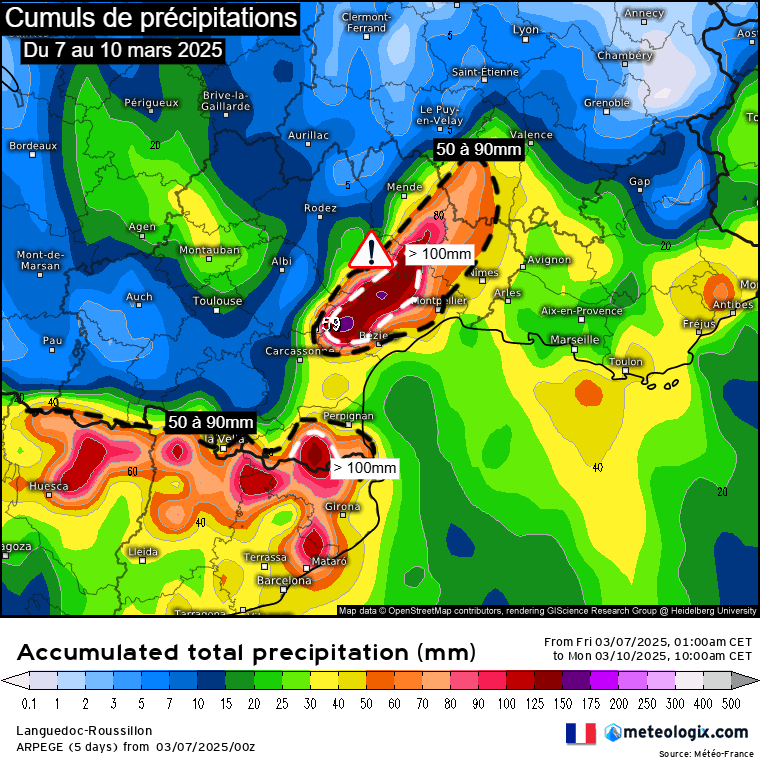 Cumuls de précipitations attendus jusqu'au lundi 10 mars 2025 – Modèle Arpège via meteologix
