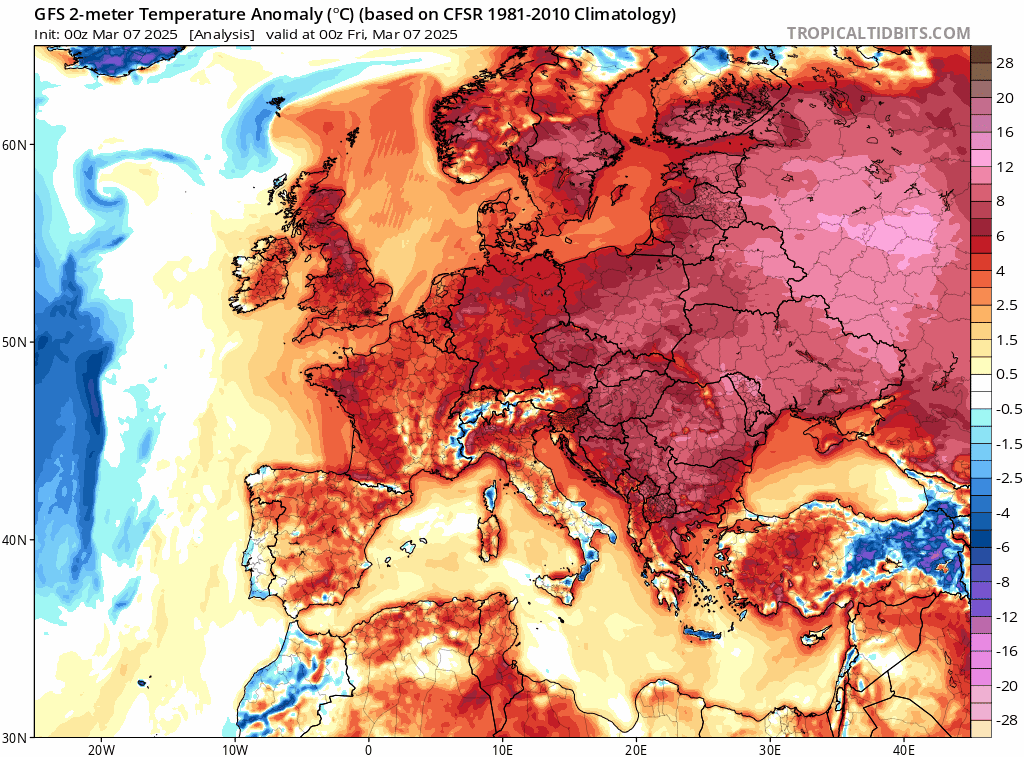 Animation des anomalies de températures à 2m sur l'Europe du 7 au 16 mars 2025 – Via TropicalTidBits