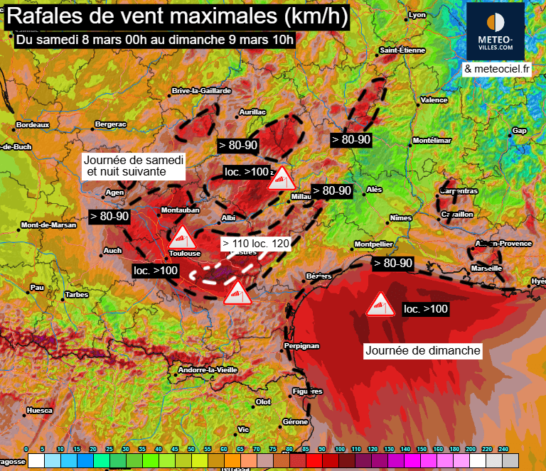 Avant ce passage pluvio-orageux actif, le vent de Sud-Est va souffler fortement du côté de l'Occitanie, notamment entre samedi et dimanche matin. On pourra en effet atteindre les 100km/h sur le Midi-toulousain, 100 à 110 voire 120km/h entre Lauragais, castrais et aux abords de la Montagne Noire. Ce vent se propagera ensuite jusqu'aux littoraux méditerranéens dimanche, faiblissant du côté de l'Occitanie.