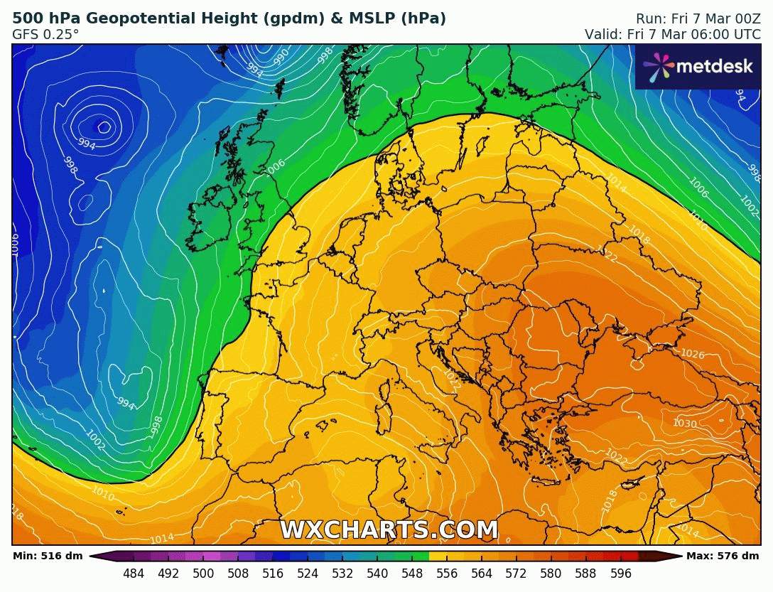 Animation des géopotentiels du 7 au 14 mars 2025 – Modèle GFS via WX CHARTS