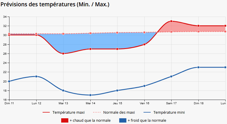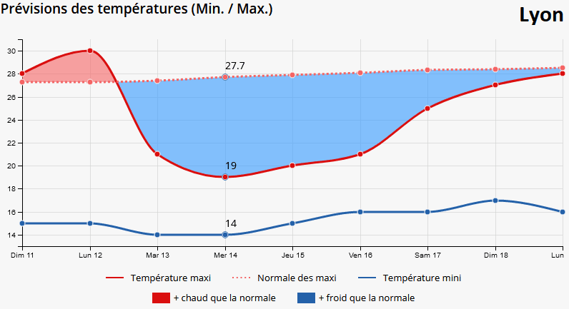 Prévision des températures et écart par rapport aux normales à Lyon - Meteo-Villes
