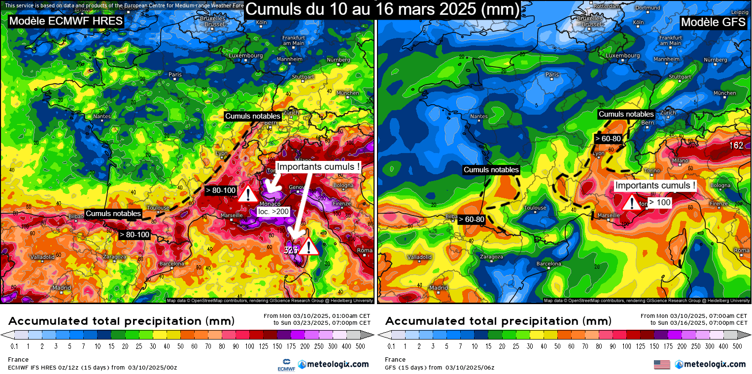 Cumuls de précipitations attendus sur la France d'ici la fin de semaine du 10 au 16 mars 2025 – ECMWF HRES et GFS via meteologix