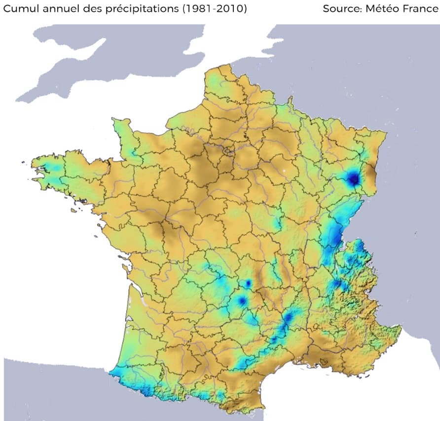 Carte des cumuls annuels de précipitation en France (normale 1981-2010) – Météo-France, tiré du livre METEO EXTREME p78