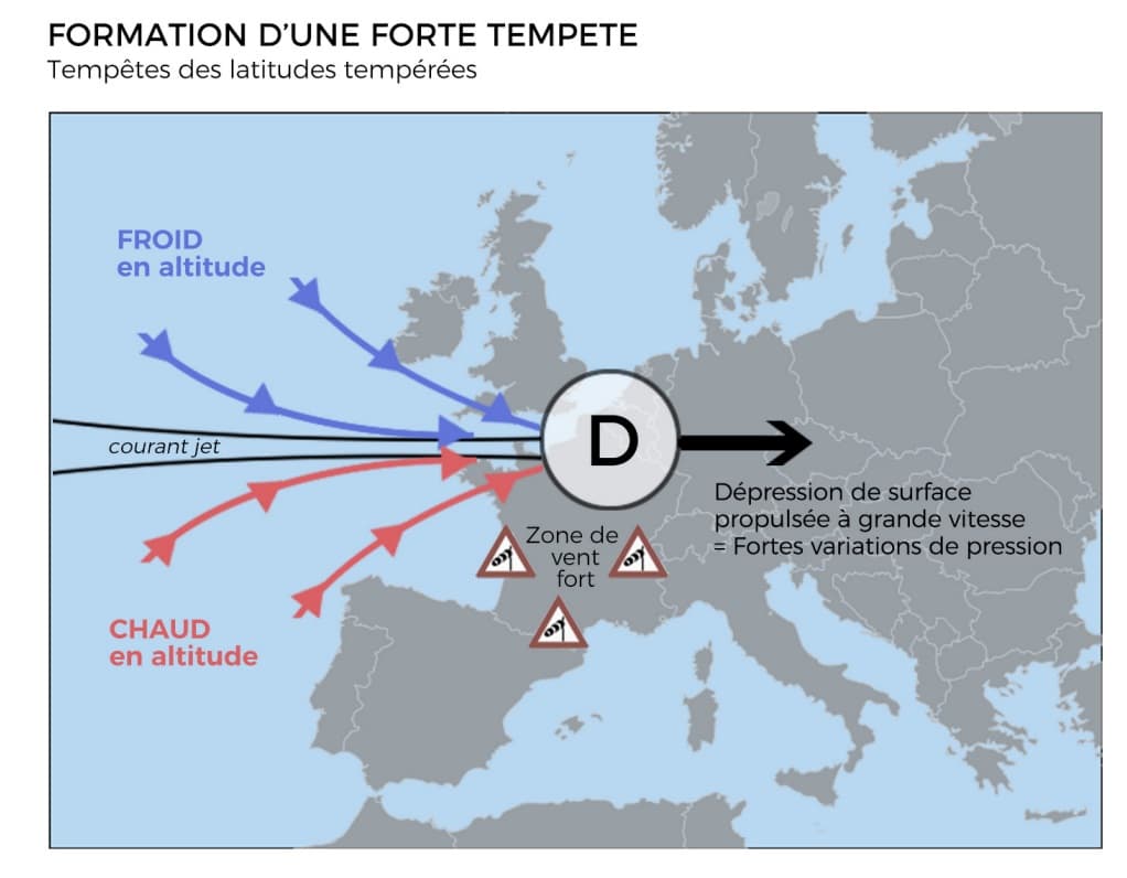 Schéma du mécanisme de formation d’une forte tempête en France – Tiré du livre METEO EXTREME p117