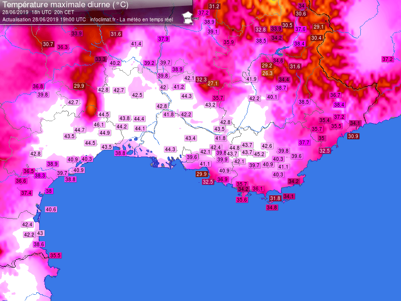 Températures maximales relevées sur le Sud du pays le 28 juin 2019 - via infoclimat.fr