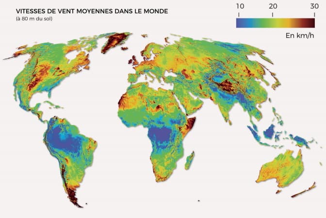 Vitesse moyennes des vents dans le monde - carte tirée du livre Météo Extrême page 122
