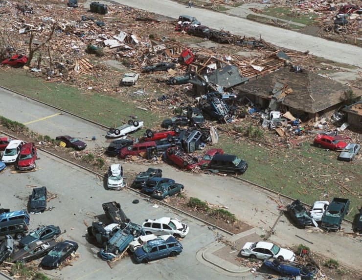 Dégâts après la tornade de Moore (USA) le 3 mai 1999 - photo via Tulsa World