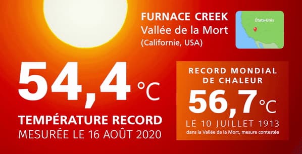 Toutefois, la zone la plus chaude sur la surface du globe est la bien nommée "vallée de la mort" aux États-Unis. Située dans une zone désertique de Californie, cette région est habituée aux températures extrêmes. Lors de l'été 2020, le record mondial de chaleur y a été battu avec une valeur maximale de 54,4°C à Furnace Creek le 16 août ! Une autre valeur de 56,7°C y avait été mesurée en juillet 1913 mais la station souffrait d'une probable surchauffe et cette valeur n'est pas homologuée.