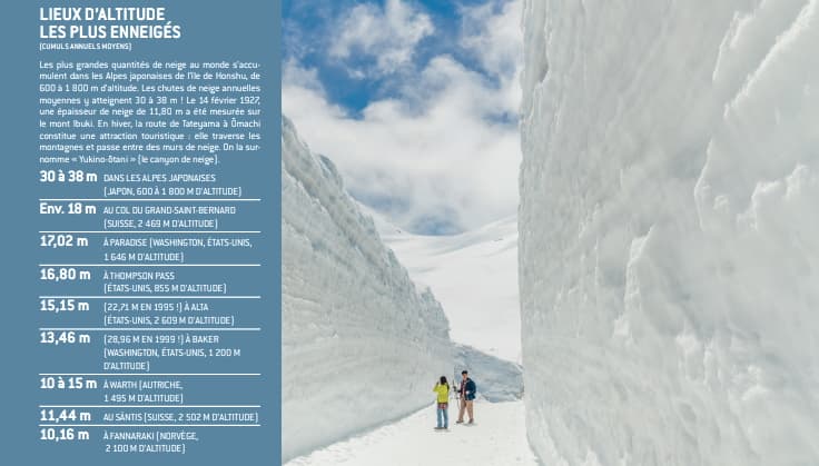 Dans le monde, les plus grandes quantités de neige s'observent dans les Alpes japonaises de l’île de Honshu, culminant jusqu'à 1800 mètres d'altitude. Les cumuls annuels moyens y sont de 30 à 38 mètres ! Le 14 février 1927, une épaisseur de neige de 11,80 m a été mesurée sur le Mont Ibuki. En hiver, la route de Tateyama à Omachi (photo ci-dessus) traverse les montagnes et passe entre des murs de neige. Elle est surnommée le "canyon de neige".