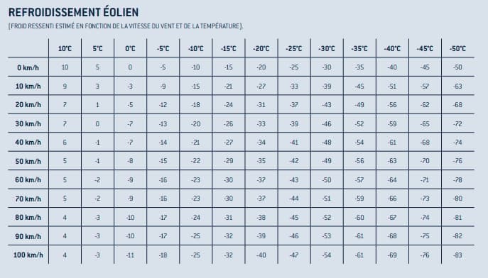 Tableau du ressenti en fonction de la température et du vent (windchill) - tableau tiré du livre Météo Extrême page 26